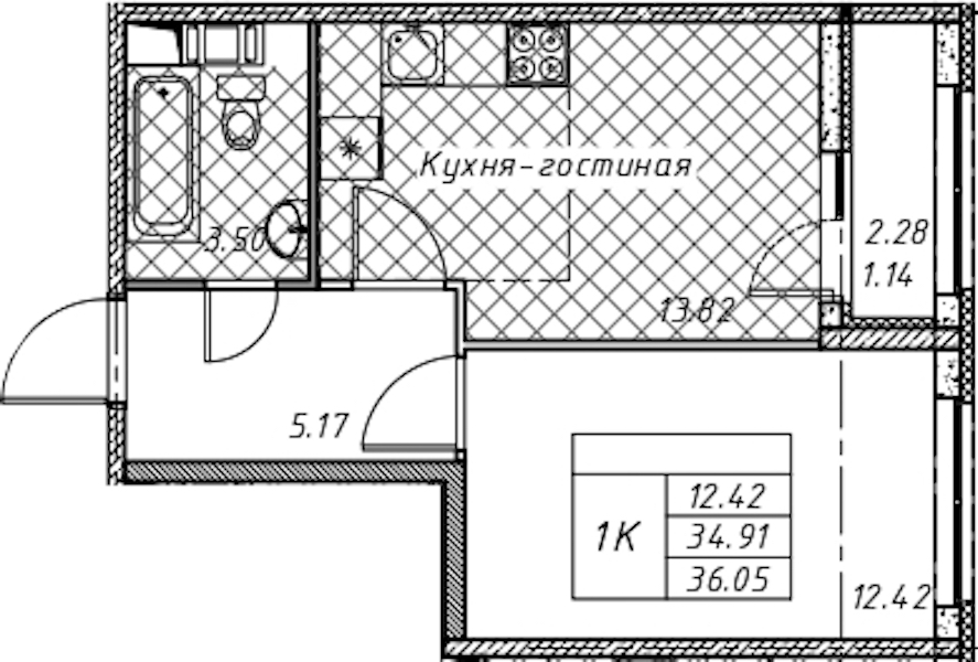 Однокомнатная квартира на 10-ом этаже 36,05 кв.м