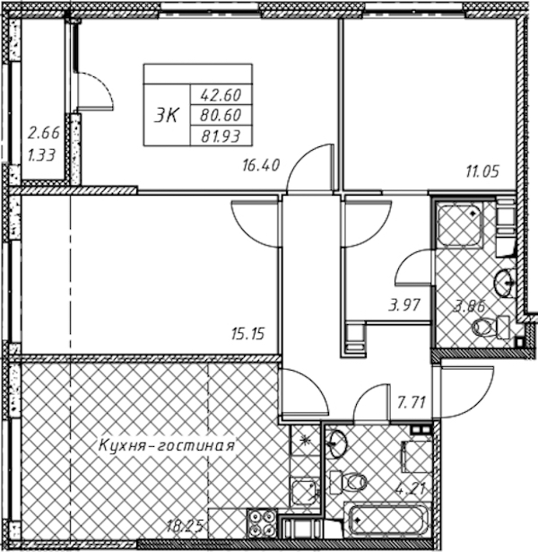 Трёхкомнатная квартира на 11-ом этаже 81,93 кв.м