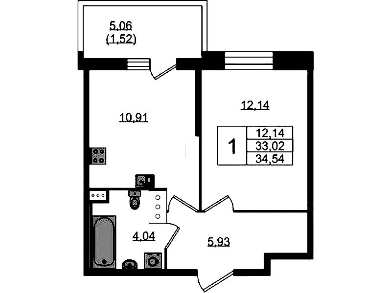Однокомнатная квартира на 10-ом этаже 34,1 кв.м