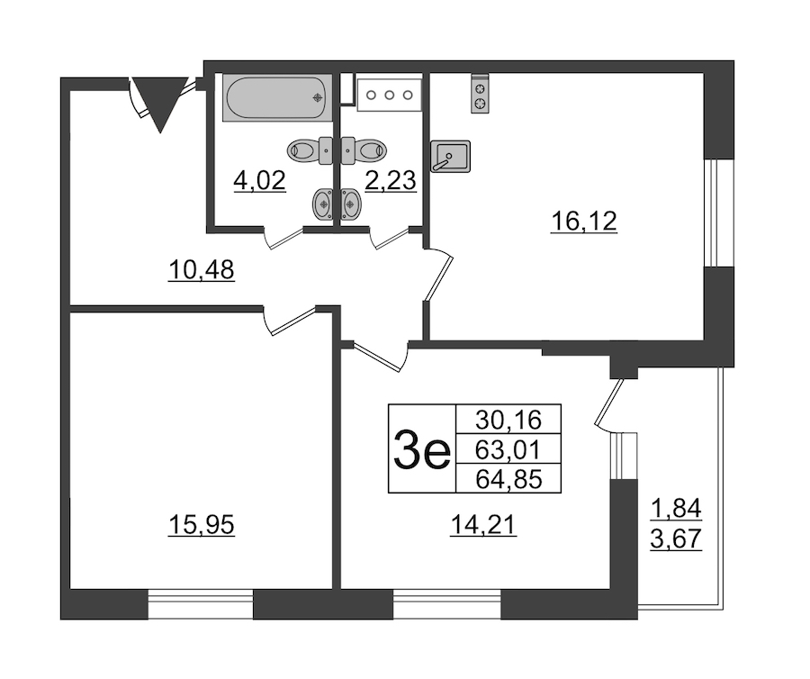 Двухкомнатная квартира на 13-ом этаже 64,85 кв.м