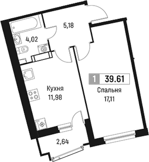 Однокомнатная квартира на 3-ем этаже 39,61 кв.м