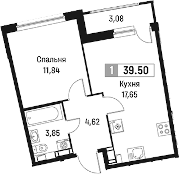 Однокомнатная квартира на 16-ом этаже 39,5 кв.м