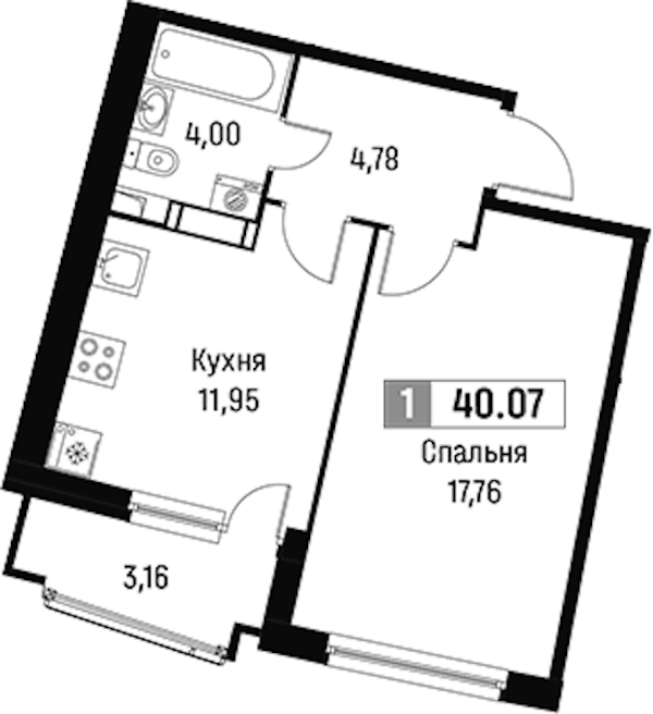 Однокомнатная квартира на 4-ом этаже 40,07 кв.м