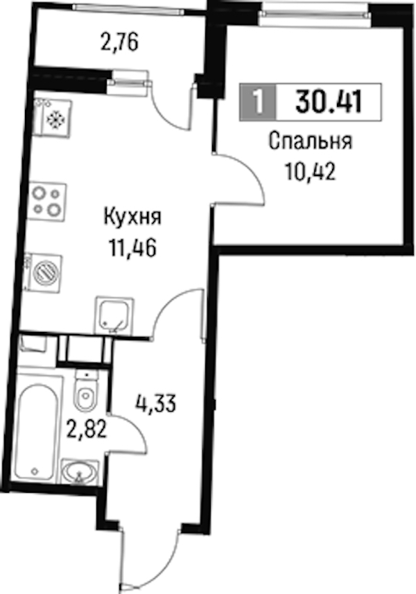 Однокомнатная квартира на 11-ом этаже 30,41 кв.м