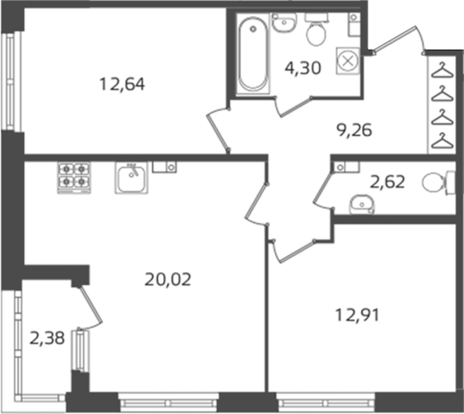 Двухкомнатная квартира на 3-ем этаже 61,75 кв.м