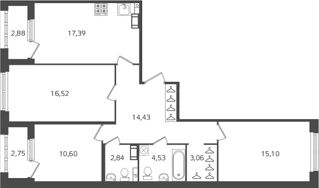- Площадь кухни17,39 м2