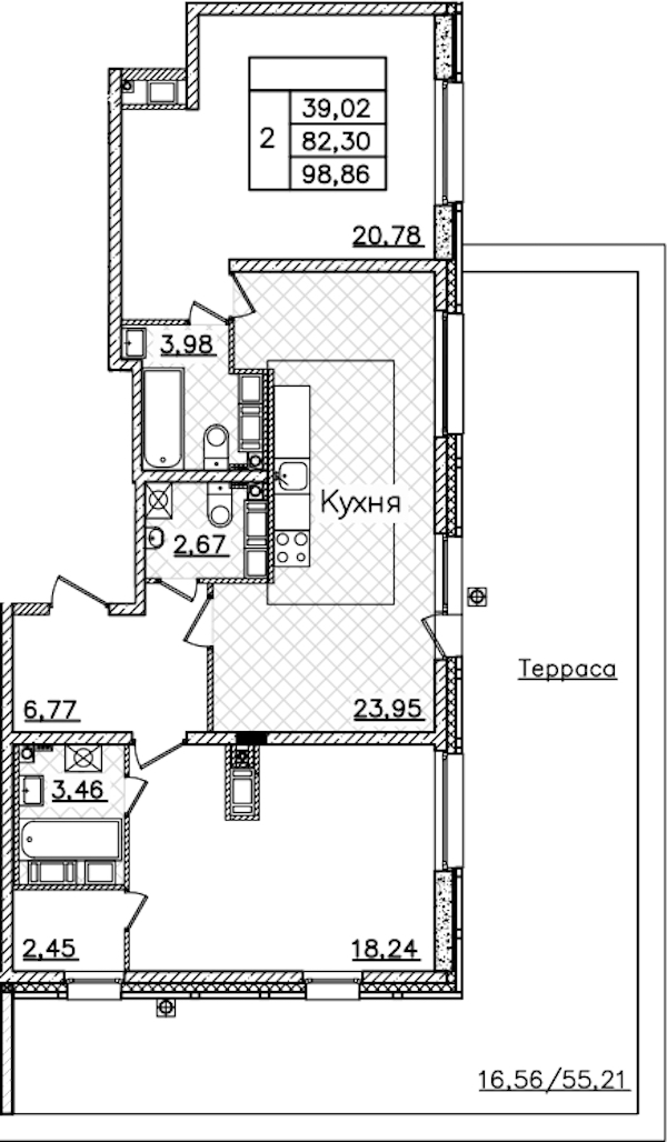 Двухкомнатная квартира на 16-ом этаже 98,86 кв.м