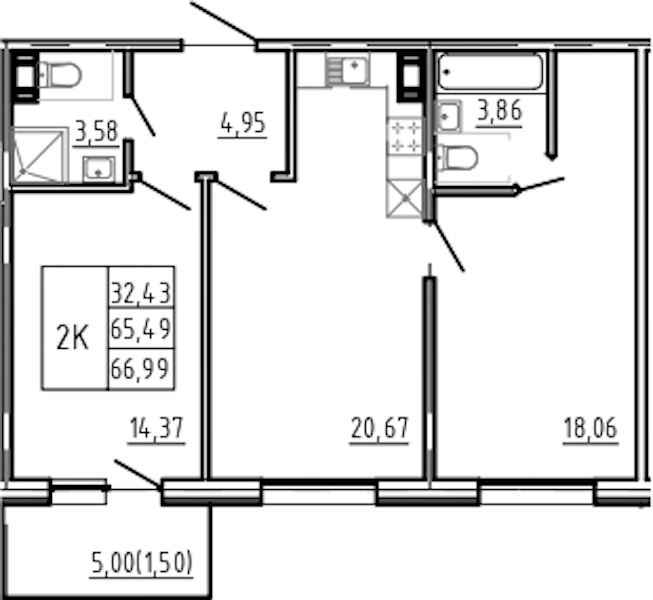 Двухкомнатная квартира на 3-ем этаже 66,99 кв.м