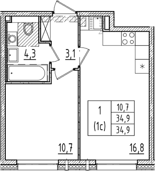 Однокомнатная квартира на 3-ем этаже 34,9 кв.м