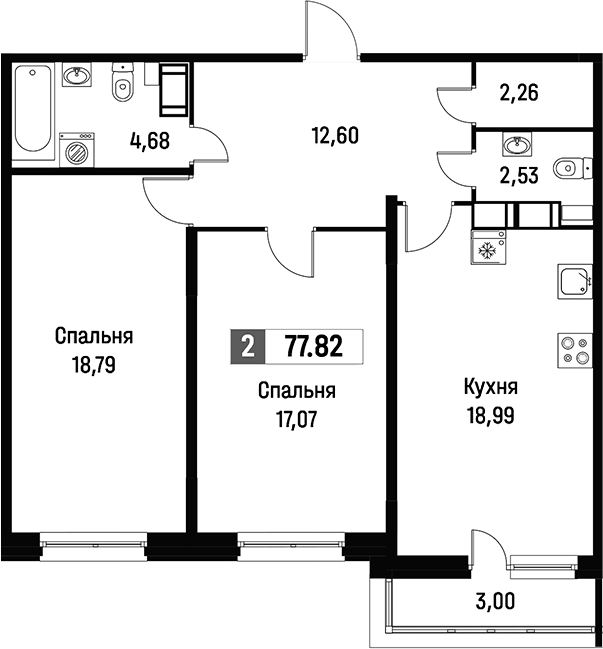 Двухкомнатная квартира на 7-ом этаже 77,82 кв.м