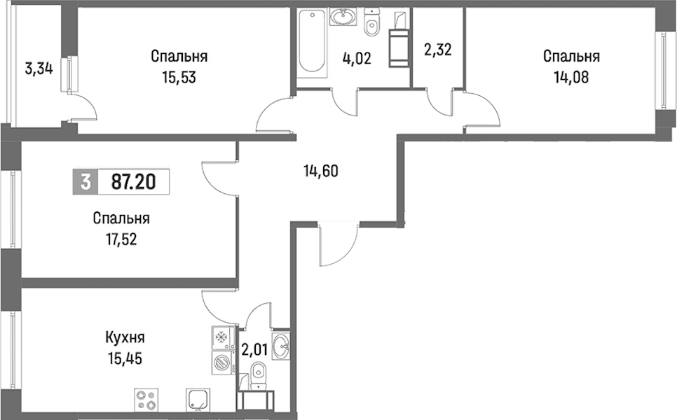 Трёхкомнатная квартира на 14-ом этаже 87,2 кв.м