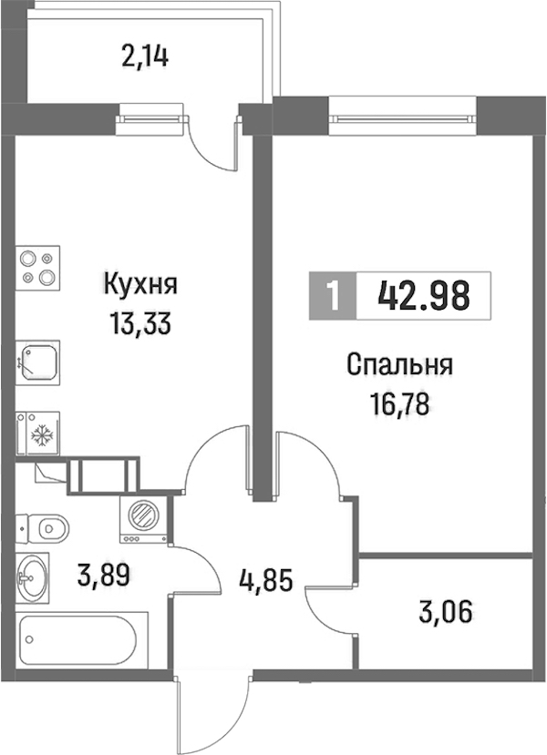 • Площадь42,98 м2