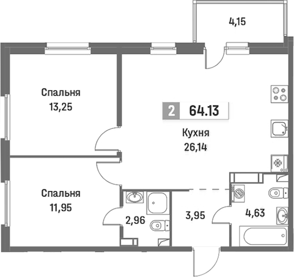 Двухкомнатная квартира на 5-ом этаже 64,13 кв.м