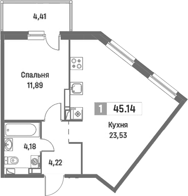 Однокомнатная квартира на 6-ом этаже 45,14 кв.м