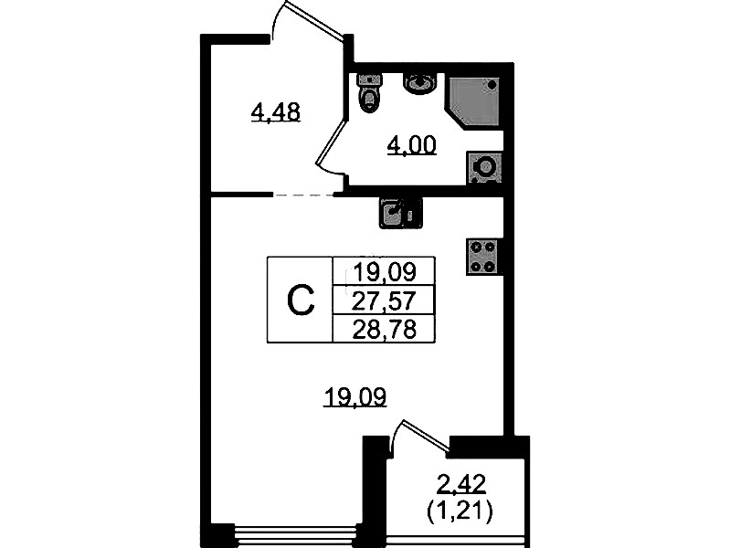Квартира-студия на 14-ом этаже 28,78 кв.м