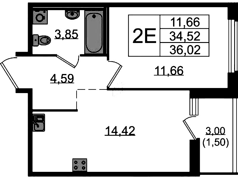 Однокомнатная квартира на 15-ом этаже 36,02 кв.м