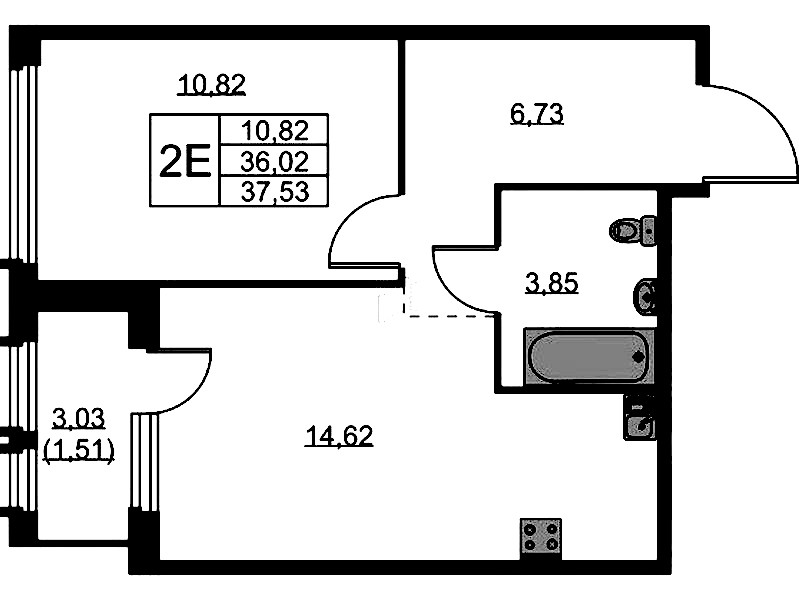 Однокомнатная квартира на 10-ом этаже 37,53 кв.м