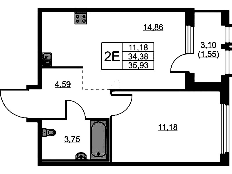 - Площадь кухни14,86 м2