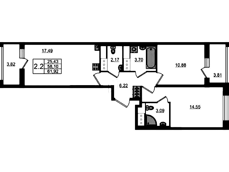 Двухкомнатная квартира на 13-ом этаже 58,1 кв.м