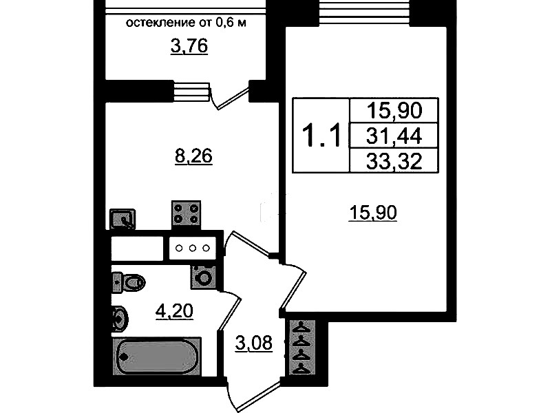 Однокомнатная квартира на 3-ем этаже 31,44 кв.м