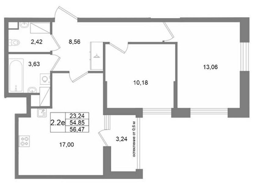 Двухкомнатная квартира на 23-ем этаже 54,85 кв.м