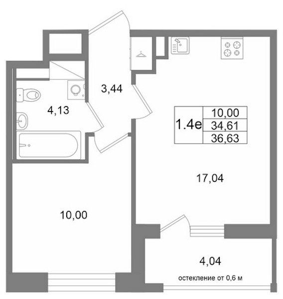 Однокомнатная квартира на 12-ом этаже 34,61 кв.м