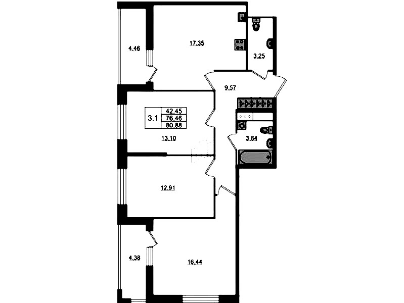 Трёхкомнатная квартира на 14-ом этаже 76,46 кв.м
