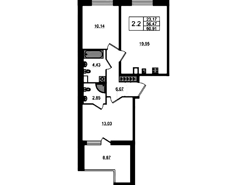 Двухкомнатная квартира на 2-ом этаже 56,47 кв.м