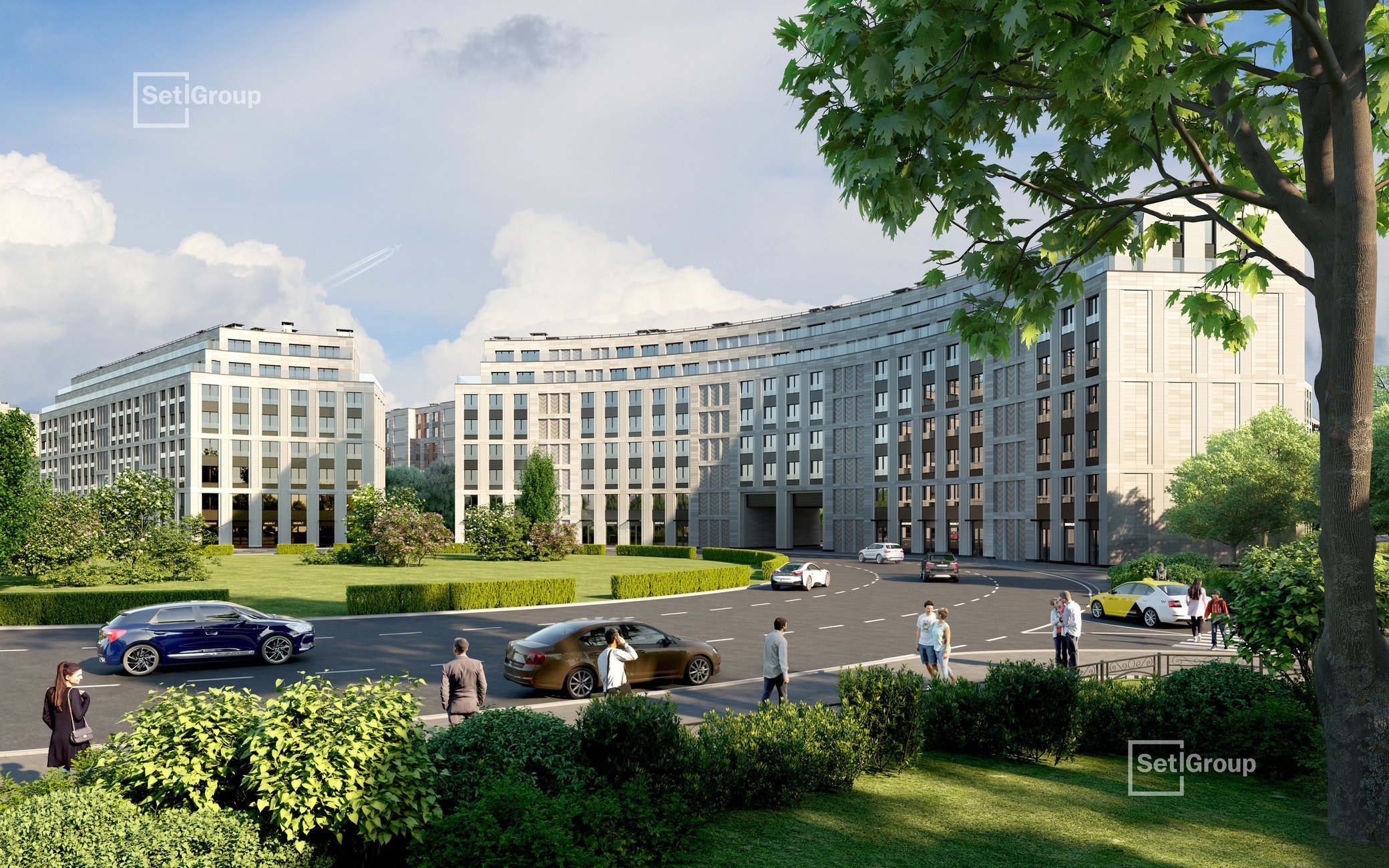 Комплекс включает два парадных корпуса полукруглой формы, которые обращены к Петровской площади. За ними вдоль центральной аллеи симметрично расположены 6 отдельных корпусов. Высота домов всего 7-8 этажей. Навесные вентилируемые фасады облицованы терракотовыми панелями и декоративной минеральной штукатуркой, цоколь – натуральным камнем. Запланирована вечерняя подсветка.