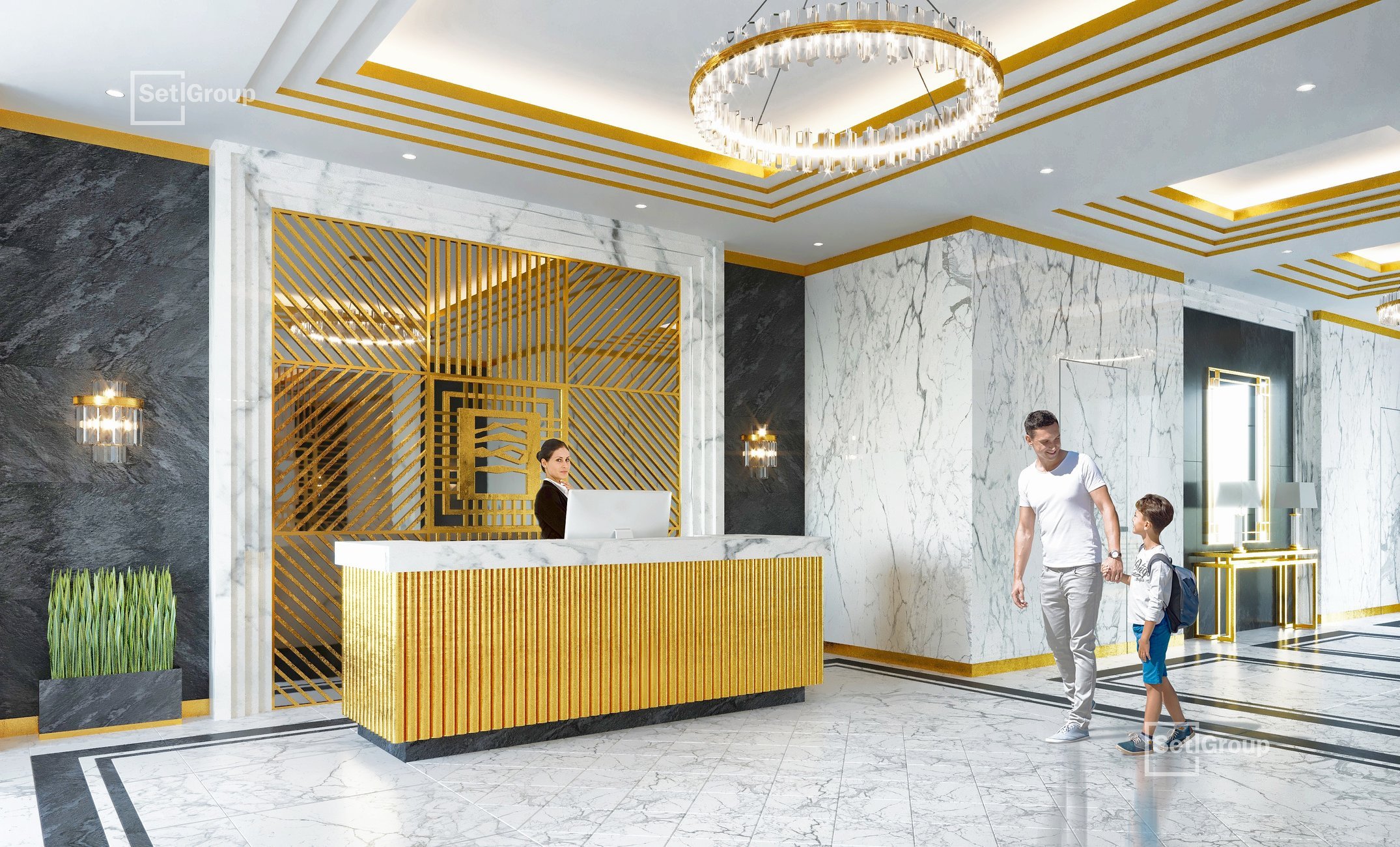 Холлы будут оформлены в стиле ар-деко с использованием натурального камня и глянцевых поверхностей. В парадных предусмотрены места, где можно оставить коляску или велосипед.