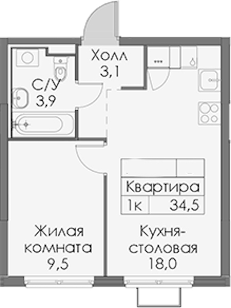 - Площадь34,5 м2