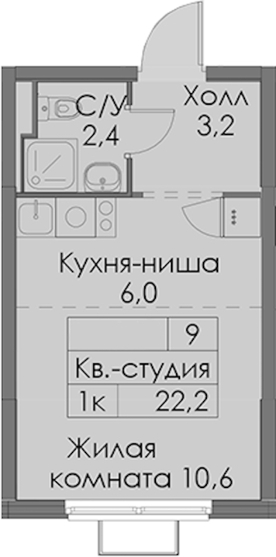 Квартира-студия на 12-ом этаже 22,2 кв.м