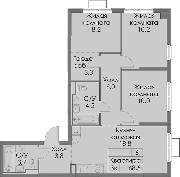 Трёхкомнатная квартира на 15-ом этаже 68,5 кв.м
