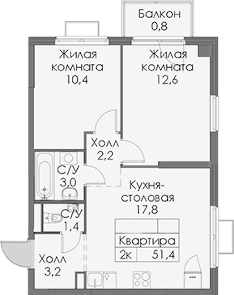- Площадь51,4 м2