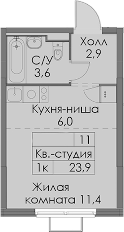 Квартира-студия на 12-ом этаже 23,9 кв.м