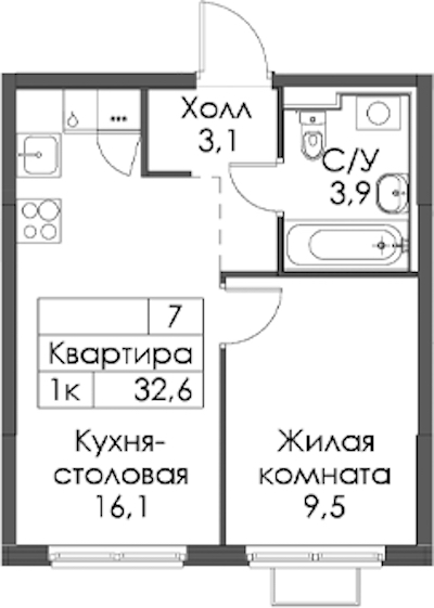 Однокомнатная квартира на 9-ом этаже 32,6 кв.м