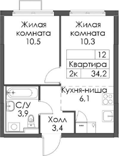 Однокомнатная квартира на 12-ом этаже 34,2 кв.м