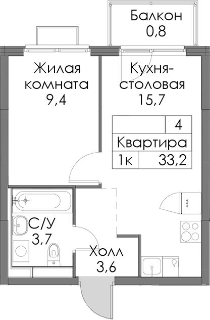 Однокомнатная квартира на 5-ом этаже 33,2 кв.м