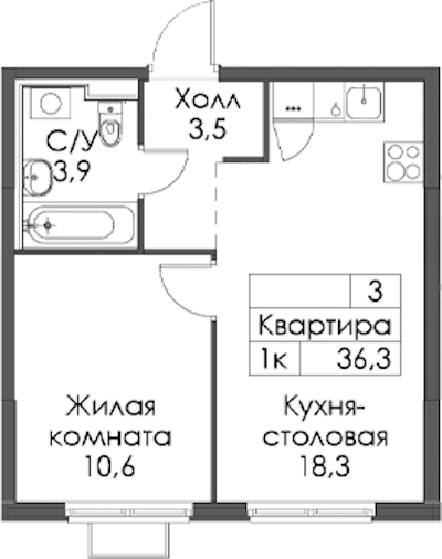 Однокомнатная квартира на 12-ом этаже 36,3 кв.м