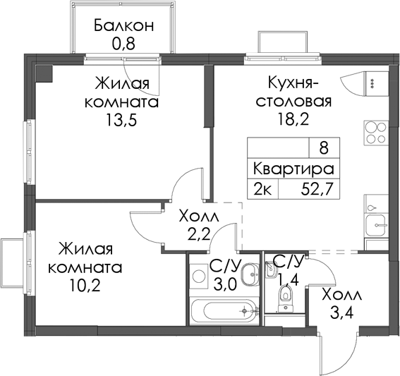 Двухкомнатная квартира на 14-ом этаже 52,7 кв.м