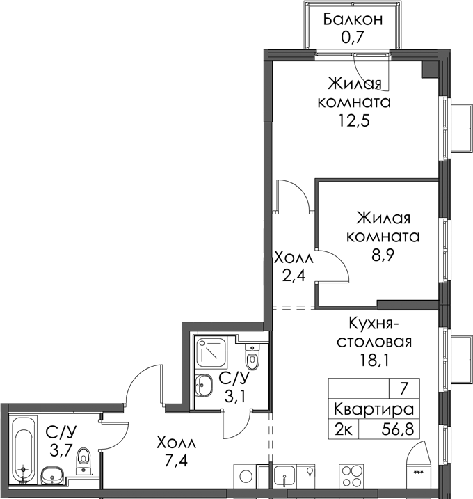 - Площадь56,8 м2