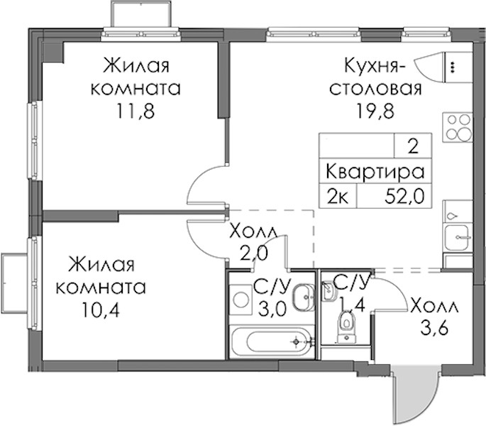 - Площадь кухни19,8 м2