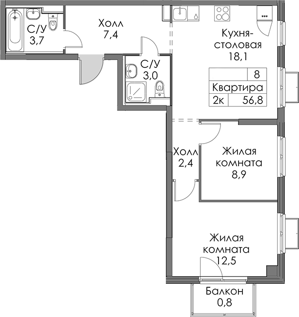 • Площадь56,8 м2