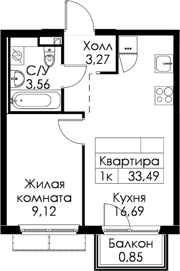 Однокомнатная квартира на 7-ом этаже 33,49 кв.м