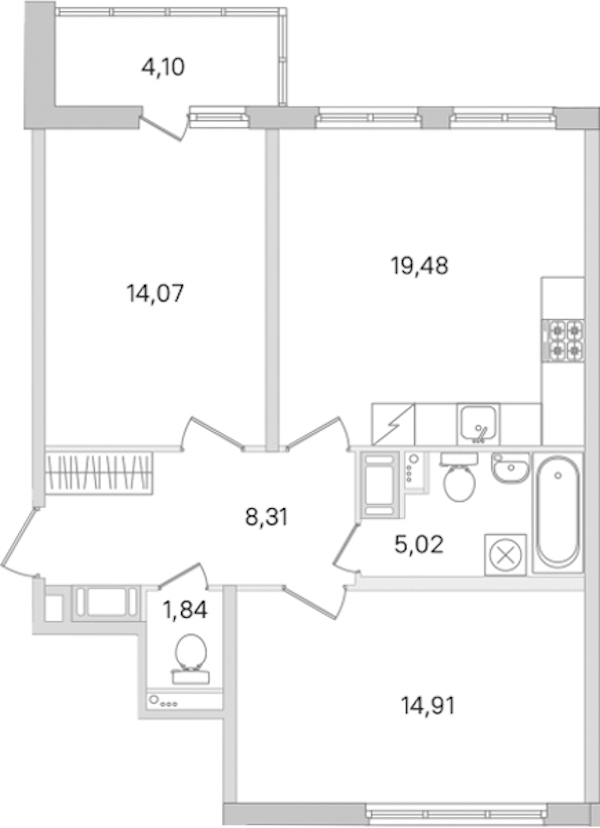 Двухкомнатная квартира на 6-ом этаже 63,63 кв.м