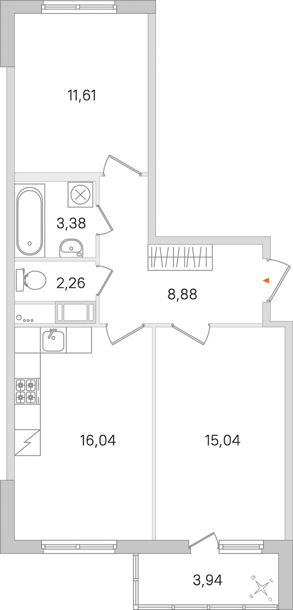 Двухкомнатная квартира на 8-ом этаже 57,21 кв.м