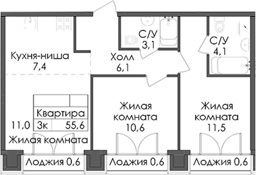 Двухкомнатная квартира на 8-ом этаже 55,6 кв.м