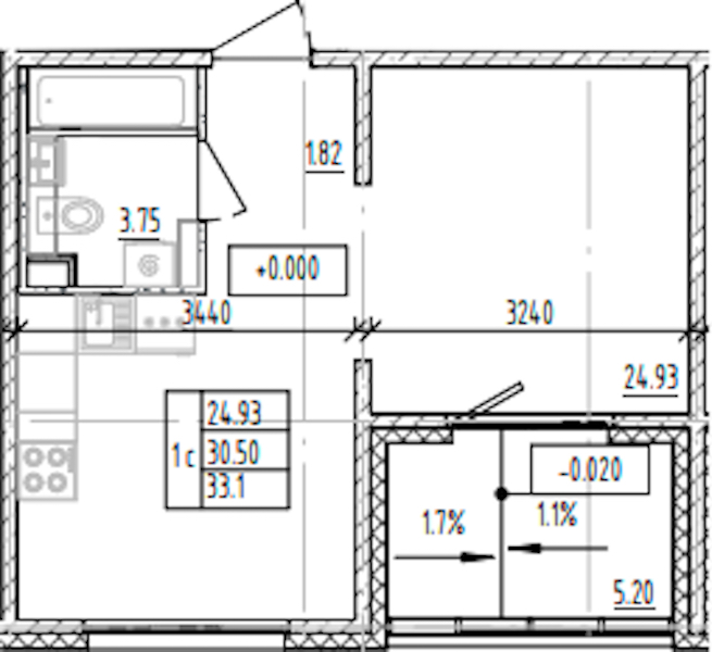 Квартира-студия на 1-ом этаже 33,1 кв.м