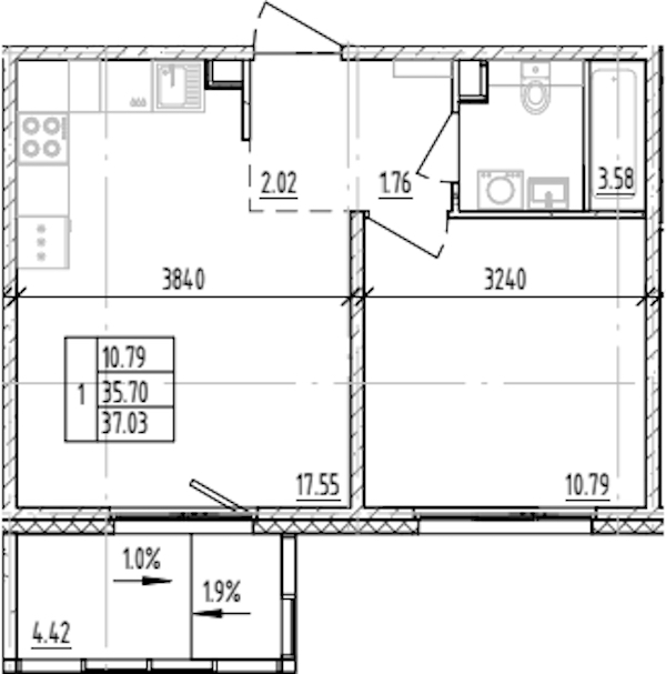 • Площадь кухни17,55 м2