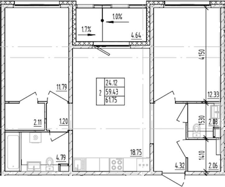 Двухкомнатная квартира на 7-ом этаже 61,75 кв.м
